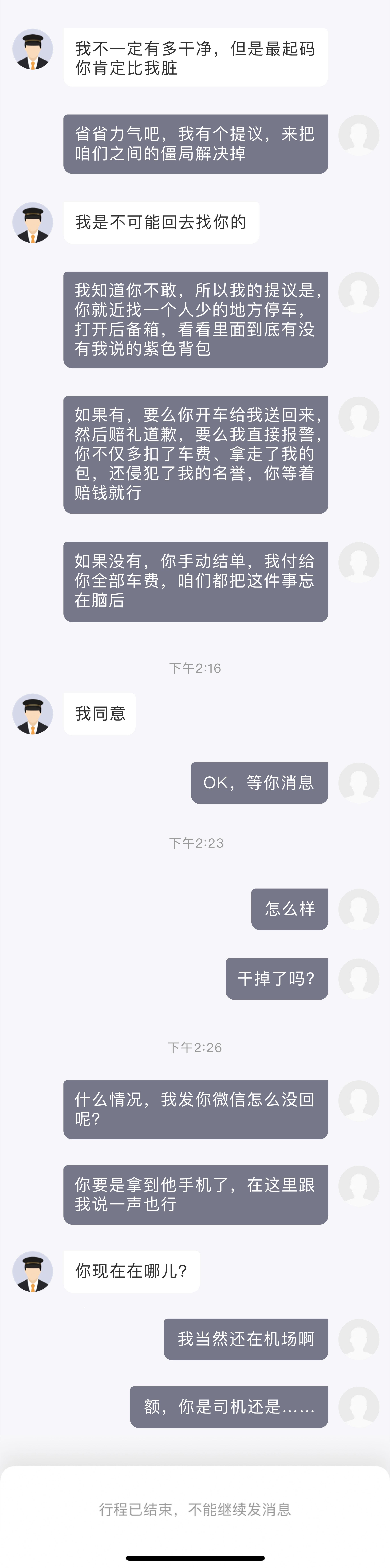 该富豪立马放弃登机,想出一招,说自己有东西落在车上了,让司机立马回来接自己,司机不愿,二人在打车软件上吵了起来。